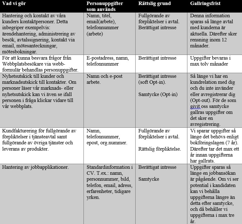 För att Tidsam AB ska kunna erbjuda sina tjänster och fullgöra sina åtaganden mot dig behöver vi hantera uppgifter om dig. I hela hanteringen av personuppgifter värnar vi din personliga integritet. Nedanför finns en tabell som beskriver de syften Tidsam AB har med sin behandling, de rättsliga grunderna som rättfärdigar behandlingen enligt dataskyddslagstiftningen och hur länge vi har kvar personuppgifterna. Tidsam AB gör ingen profilering eller automatiserat beslutsfattande med dina personuppgifter.